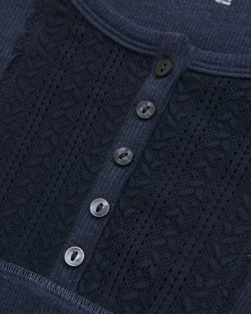 Easy-fitting short-sleeve henley tee in our soft cotton-blend fabric Features lace-trim details at the chest, a button-up neckline and an embroidered icon at the hem. Imported.