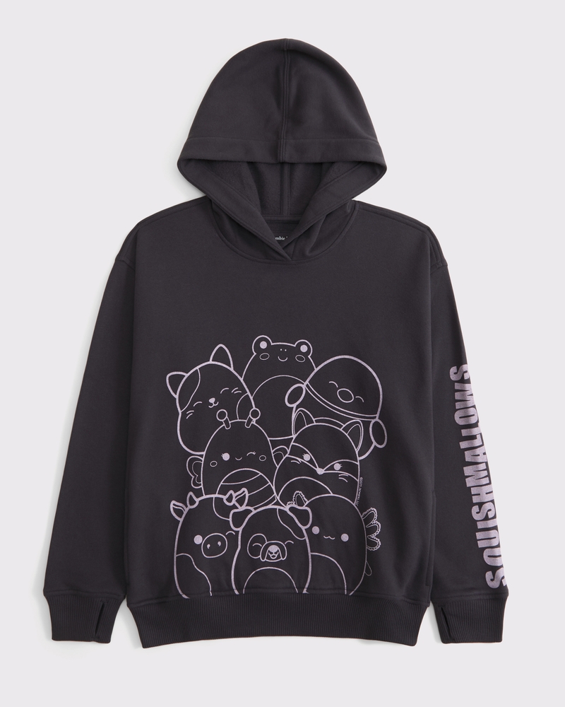 Super comfy popover hoodie in our super soft fleece fabric and longer length, with Squishmallows graphic detail at chest, front pouch pocket, banded hem and thumbholes at cuffs. Imported.