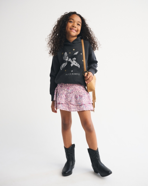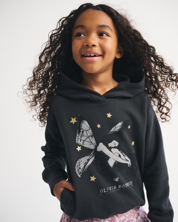Super comfy popover hoodie in our super soft fleece fabric and longer length. Features Olivia Rodrigo graphic detail at chest, front pouch pocket, banded hem and thumbholes at cuffs. Imported.