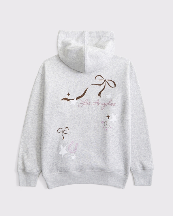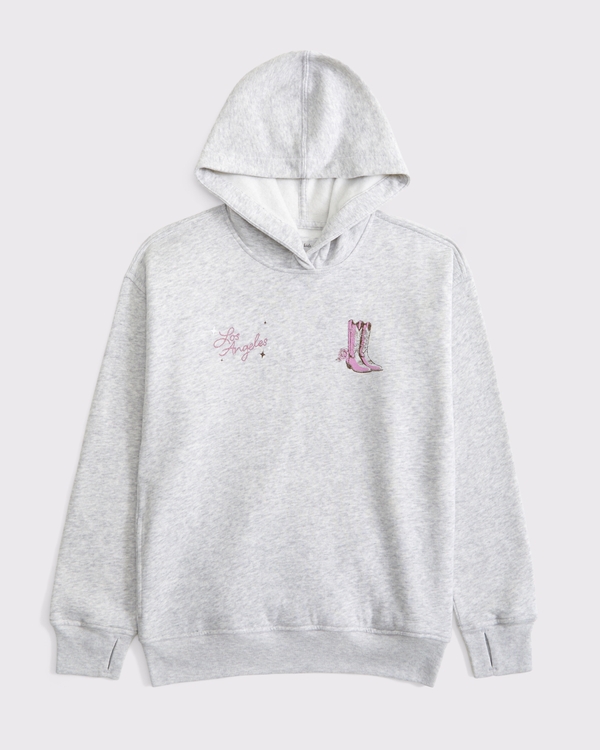 Super comfy popover hoodie in our super soft fleece fabric and longer length. Features Los Angeles graphic details at chest and back, front pouch pocket, banded hem and thumbholes at cuffs. Imported.
