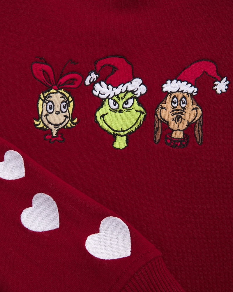 Super comfy sweatshirt in our core fleece fabric and longer length, with The Grinch graphic details at chest, crew neckline, banded hem and thumbholes at cuffs. Imported.