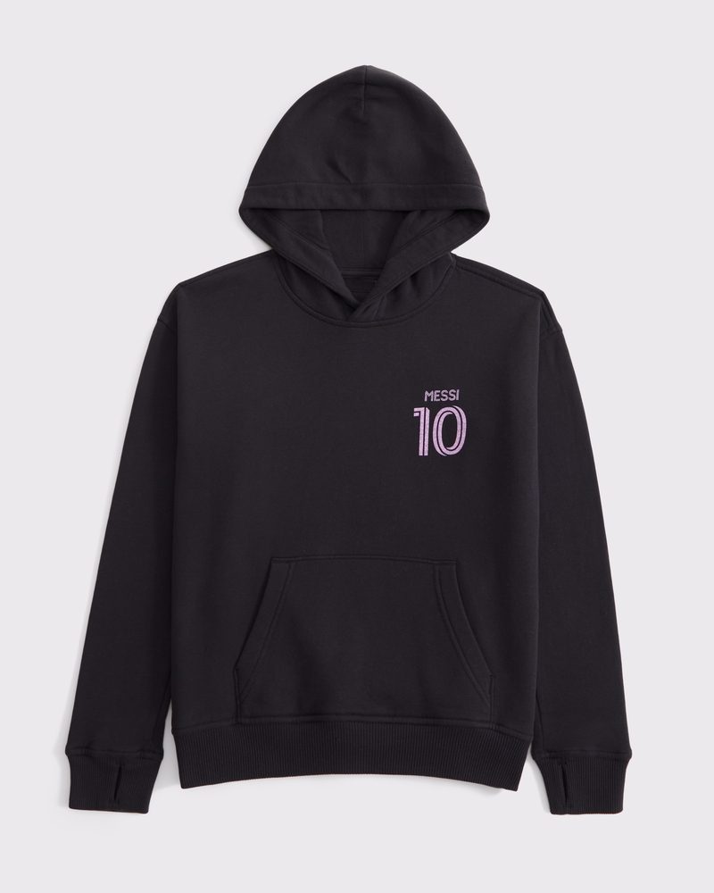 Comfy popover hoodie in our soft fleece fabric, featuring Lionel Messi-inspired graphic details at left chest and back, front pouch pocket, ribbed hem and thumbholes at cuffs. Imported.