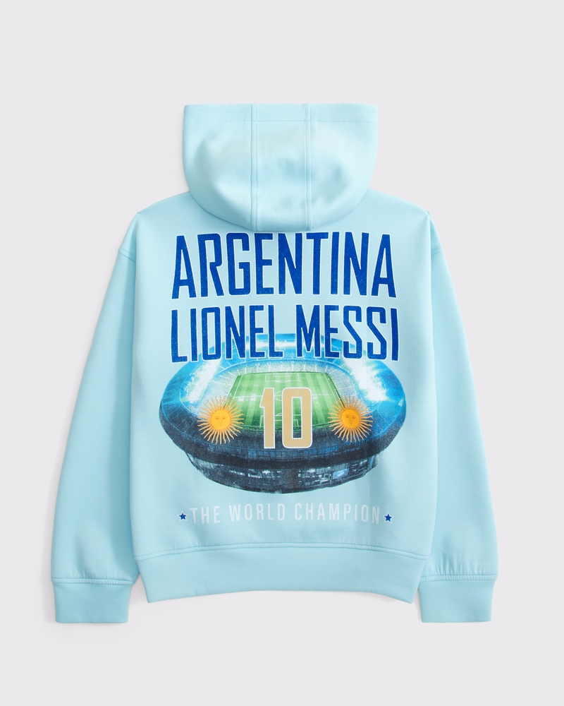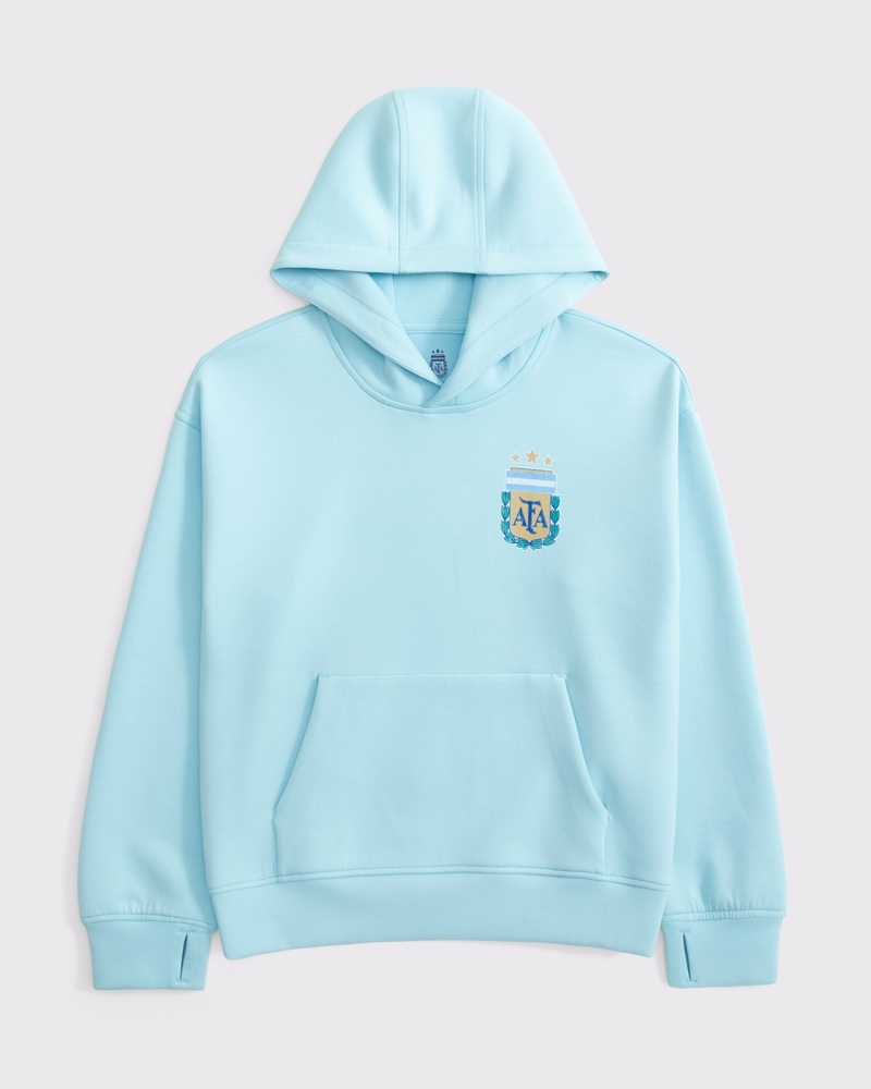 Comfy popover hoodie in our neoknit active fabric, with 4-way stretch, breathability and sweat-wicking properties. Features Lionel Messi Argentina Football Club graphics at left chest and back, front pouch pocket, banded hem and thumbholes at cuffs. Imported.