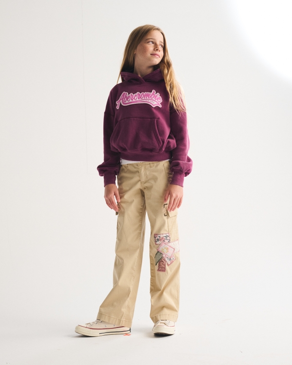 Comfy popover hoodie in a soft fleece fabric. Features embroidered logo detail at chest, front pouch pocket, ribbed hem and thumbholes at cuffs. Imported.