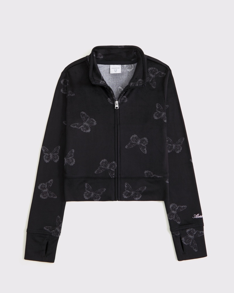 Super comfy sweatshirt in our super soft velour fabric, with embroidered logo detail at sleeve, zip-up front, mockneck collar, side pockets, banded hem and thumbholes at cuffs. Imported.