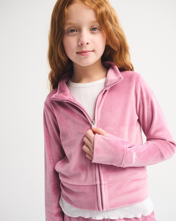 Super comfy sweatshirt in our super soft velour fabric, with embroidered logo detail at sleeve, zip-up front, mockneck collar, side pockets, banded hem and thumbholes at cuffs. Imported.