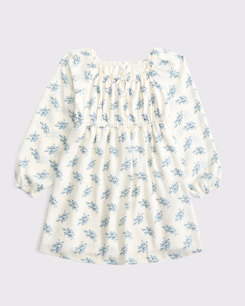 On-trend long-sleeve mini dress in a soft crepe fabric, featuring an all-over print pattern, a slimmed waist and adjustable bow tie at the chest. Imported.