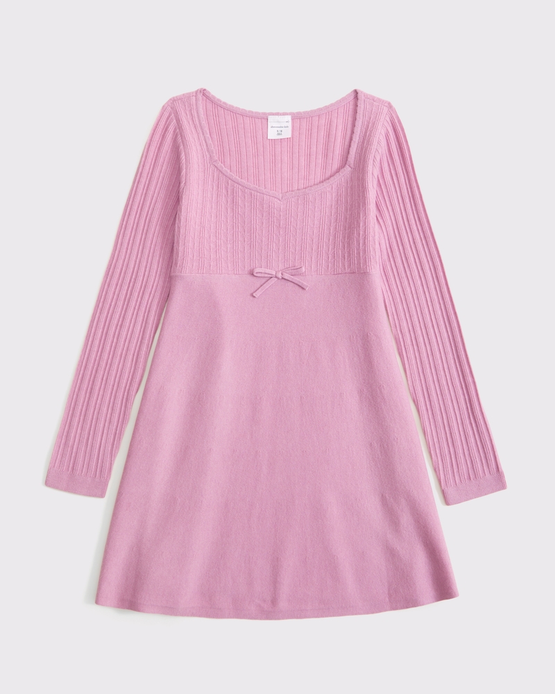 Comfy long-sleeve mini sweater dress in a babydoll silhouette, with a pointelle fabric bodice, bow detail and ribbed sleeves. Imported.
