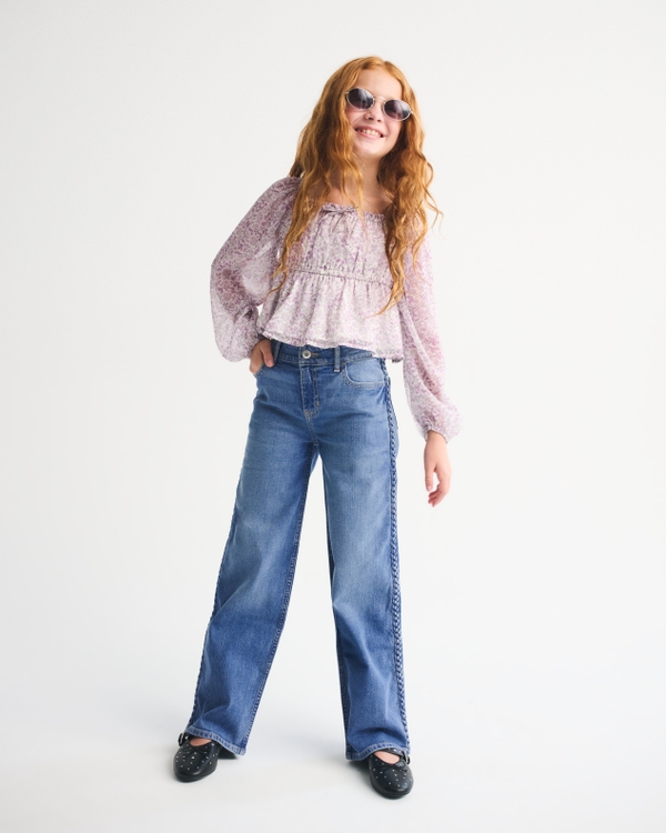 Flattering long-sleeve top in a flowy chiffon fabric and babydoll silhouette, with functional tie-front detail, on-trend puff sleeves with elastic cuffs, ruching details along the bodice, square neckline and curved hem. Imported.