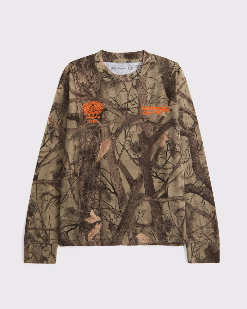 Comfortable long-sleeve tee in a soft cotton-blend fabric, with on-trend camo pattern, Honda Racing-inspired graphic details at chest and back and crew neckline. Imported.