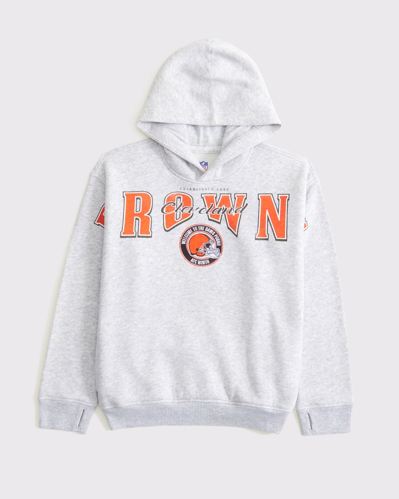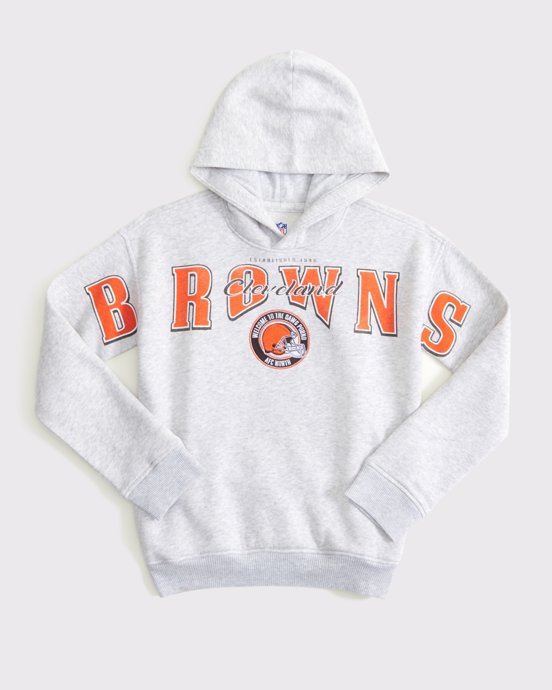 Comfy popover hoodie in our soft fleece fabric, featuring Cleveland Browns-inspired graphic detail at chest and sleeves, side pockets, ribbed hem and thumbholes at cuffs. Imported.