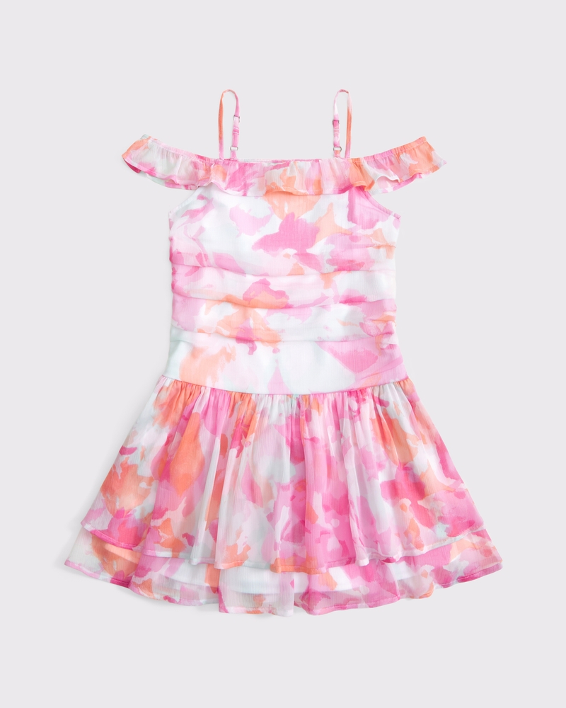 Flattering mini dress in our soft chiffon fabric, featuring off-the-shoulder detail with adjustable straps, on-trend ruffle detail at the neckline, ruching details along the bodice and a ruffle skirt. Imported.