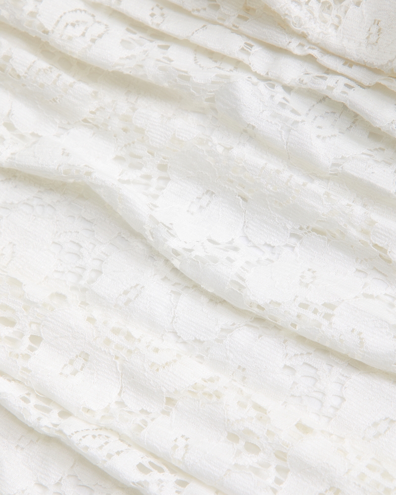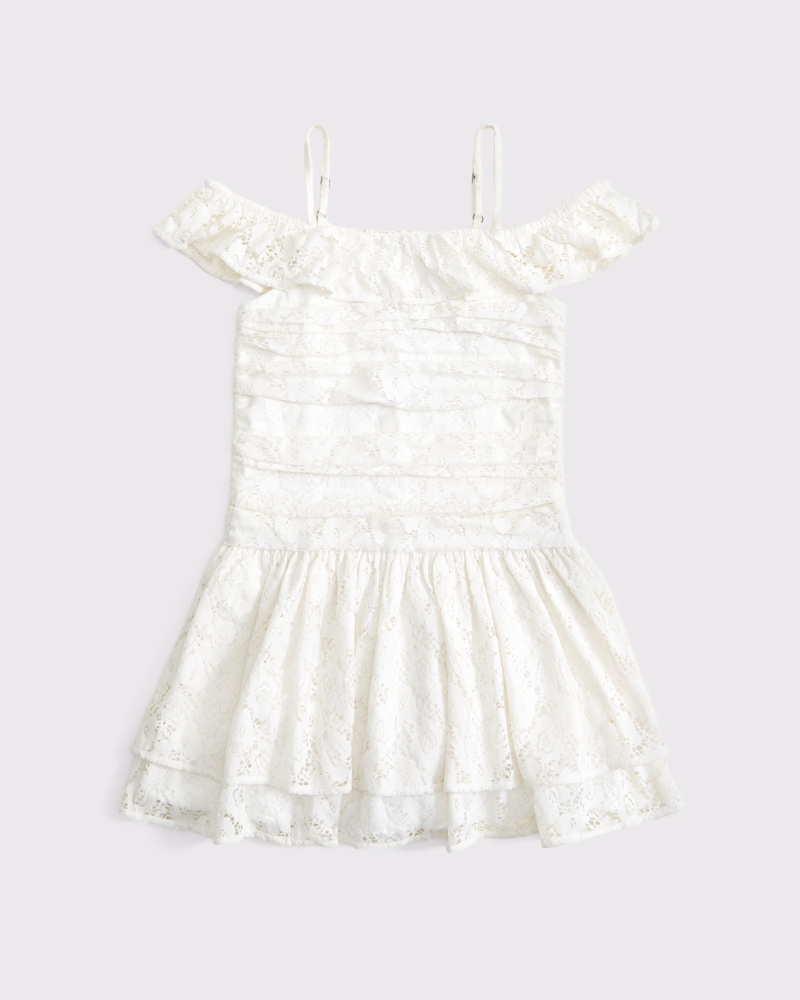 Flattering mini dress in our soft fabric, featuring all-over lace details, off-the-shoulder detail with adjustable straps, on-trend ruffle detail at the neckline, ruching details along the bodice and a ruffle skirt. Imported.