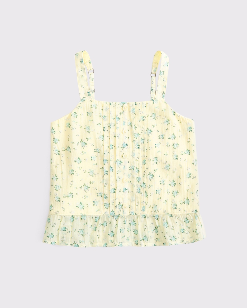 Easy-fitting cami top in our soft cotton fabric and short length, that covers the waistband and hits slightly above the hips. Features pleating details along the bodice, a button-through detail, adjustable straps and a peplum hem. Imported.