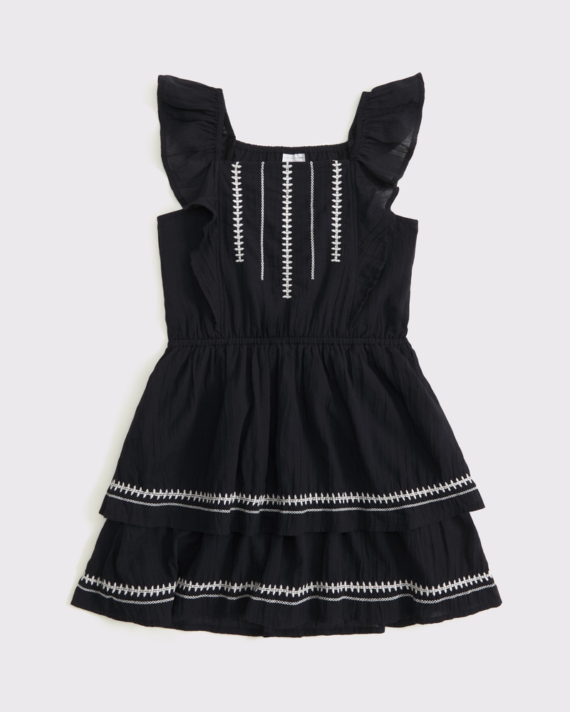 On-trend mini dress in a soft gauzy fabric, with a square neckline, and ruffle and embroidery details along the bodice and waist. Imported.