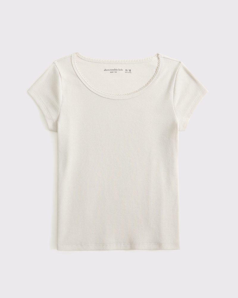 Slim-fitting short-sleeve tee in our soft rib fabric and short length, that covers the waistband and hits slightly above the hips. Features all-over ribbed detail and trim detail along the scoop neckline. Imported.