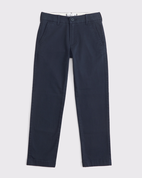 Comfortable chino pants in a satin twill fabric and straight fit through the leg, with pockets throughout and belt loops. Sizes 5/6 through 7/8 feature adjustable waistbands and hook and slide closures. Sizes 9/10 through 15/16 feature a standard zipper and button fly. Imported.