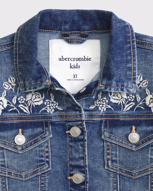 Cozy jacket in a soft denim fabric. Features floral embroidered details at the chest, a button-up front, seaming details and front pockets. Imported.