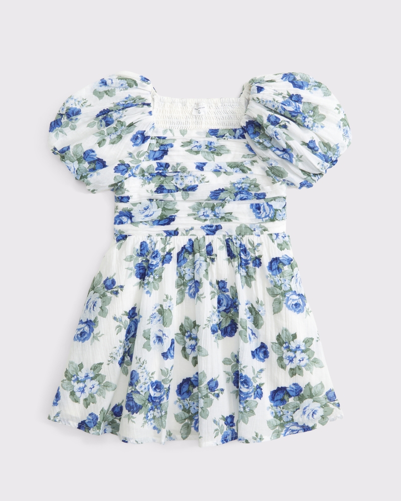Our cute short-sleeve mini dress in a soft woven fabric. Features puff sleeves, pleating details along the bodice, back smocking and a square neckline. Imported.