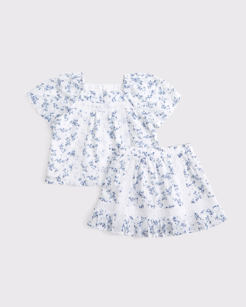 Our cute set in a super soft woven fabric. This short-sleeve top features pleated and lace-trim details along the bodice, a square neckline and back smocking. This skort features an elasticated waistband, pleated and lace-trim details and built-in shorts. Imported.