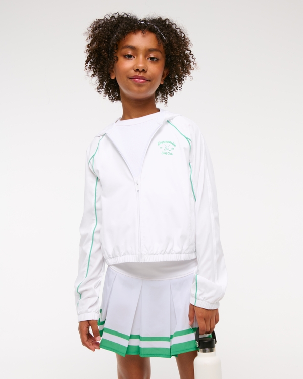 Our new lightweight active golf jacket in a synthetic fabric, featuring logo details, green piping details, zip-up front and pockets. Imported.