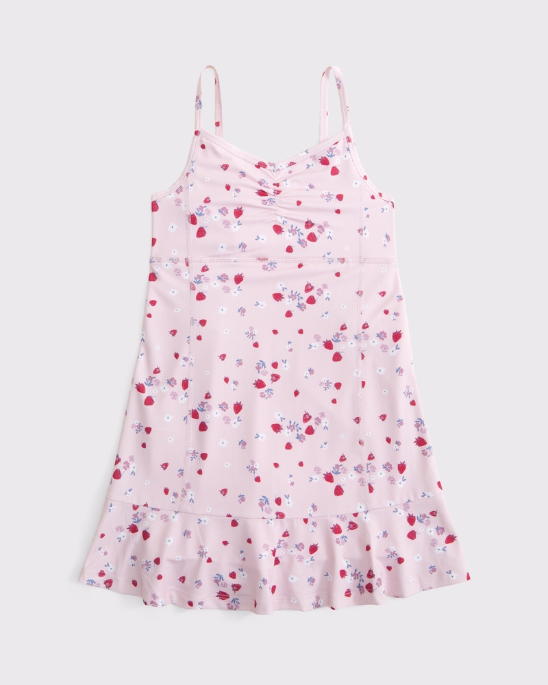 Comfy mini dress in our super soft active fabric and babydoll silhouette. Features cinching detail at the bust, built-in shorts, a V-neckline and adjustable straps. Imported.