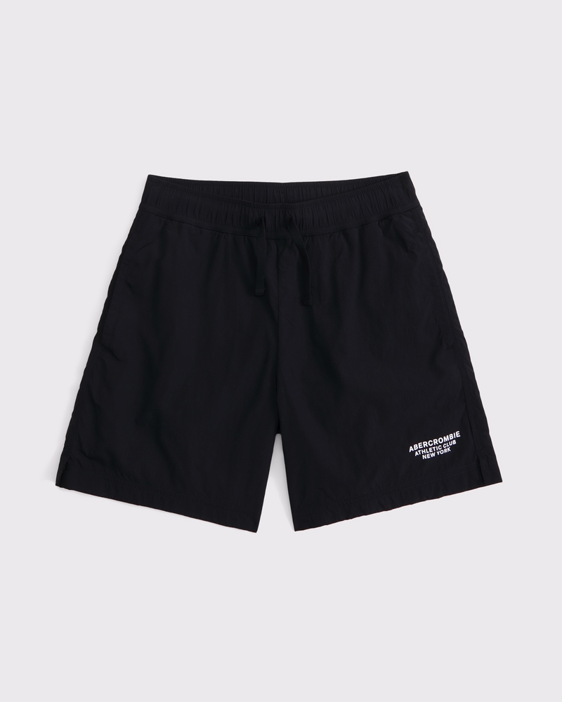 Comfy above-the-knee length active shorts in a synthetic fabric. Features graphic logo detail, a pull-on style elasticated waistband, exterior drawcords, mesh interior lining and pockets. Imported.