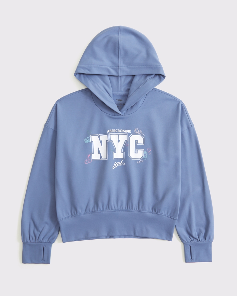 Comfy popover hoodie in our soft active fabric, with 4-way stretch and moisture-wicking properties. Features graphic logo detail at chest, side pockets, banded hem and thumbholes at cuffs. Imported.