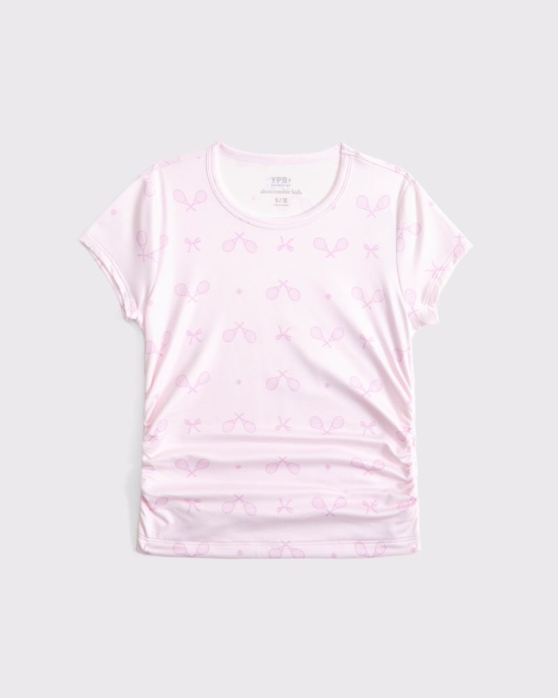 Comfy short-sleeve tee in our new active fabric and medium length, that hits right at the hips, featuring side ruching details along the bodice, crew neckline and straight hem. Imported.