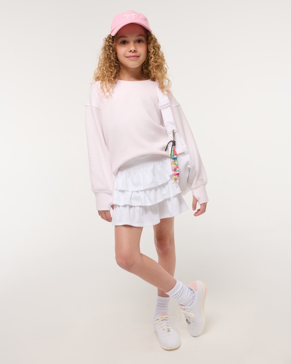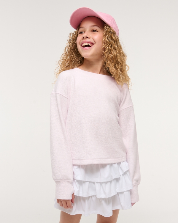 Super comfy sweatshirt in our textured active fabric, featuring on-trend knot detail at back, graphic logo detail at sleeve, crew neckline and thumbholes at cuffs. Imported.