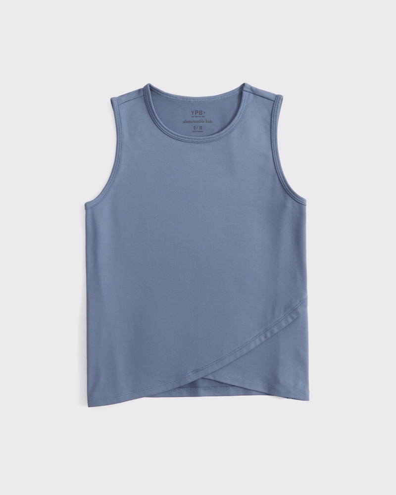 Comfy active tank in our soft jersey fabric and medium length, that hits right at the hips. Features a crew neckline and wrap-front detail. Imported.