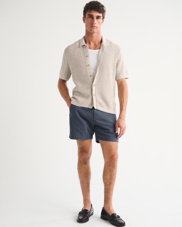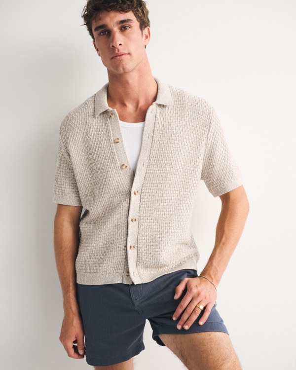 Our 100% cotton space-dyed short-sleeve sweater polo in a relaxed-fit silhouette. Features textural stitching details throughout, button-up front, classic collar and banded hem and cuffs. Imported.