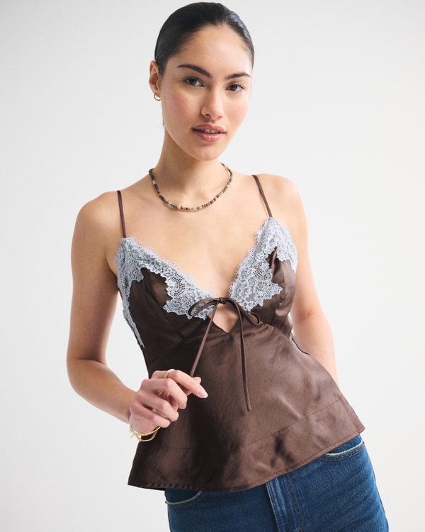 Flattering cami top in our textured satin fabric and body-skimming silhouette. Features a lace overlay with an adjustable tie, V-neckline and adjustable cami straps. This cami is fully reversible with tear-away tags for a seamless look, designed to be worn on either side. Imported.