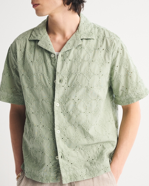 Comfortable short-sleeve button-up shirt in our lightweight and breathable linen-blend fabric, that's perfect for hot sunny days. Features a relaxed-fit silhouette, embroidered details throughout, left chest pocket, resort-style camp collar and straight hem. Imported.