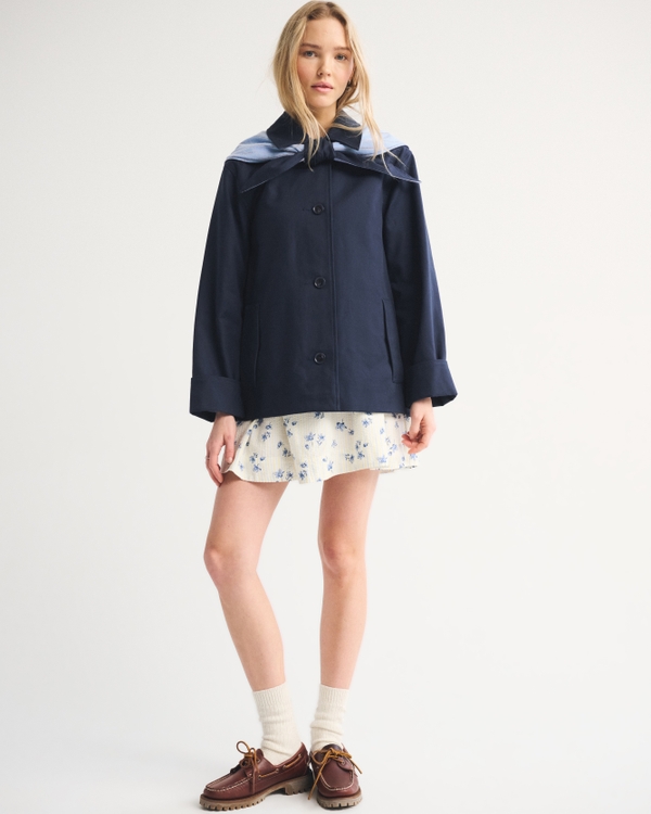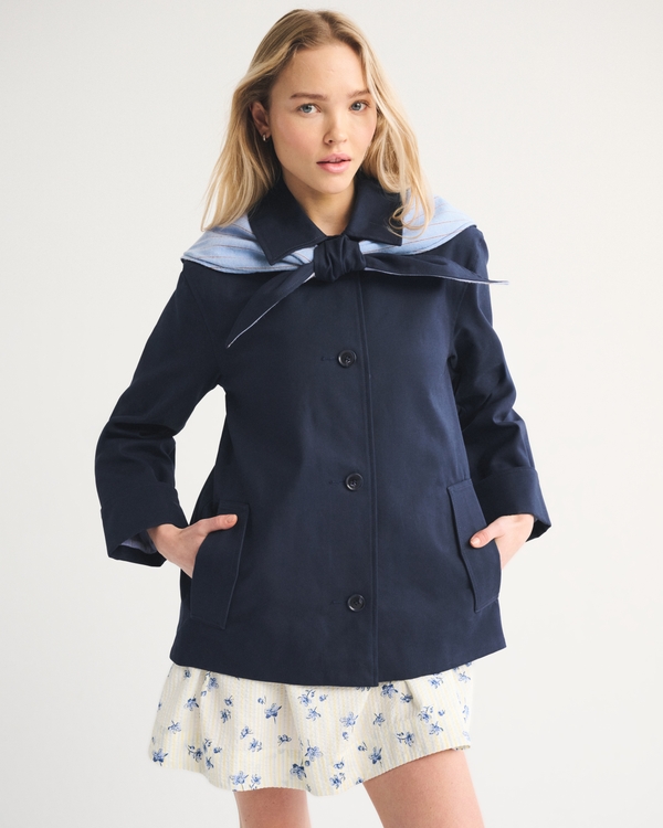 Our A-line trench coat in our water-resistant technical cotton fabric. Features a removable scarf detail, button-up front, side pockets and a cozy interior lining. Imported.