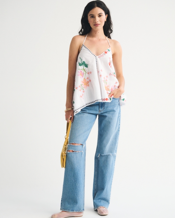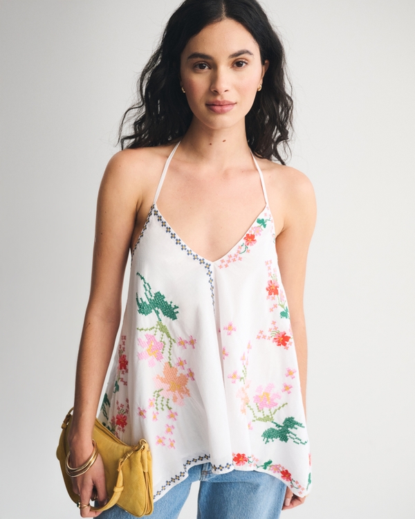 Easy-fitting cami top in our lightweight cotton fabric. Features embroidered details throughout, adjustable tie halter and back details, and handkerchief hem. Imported.