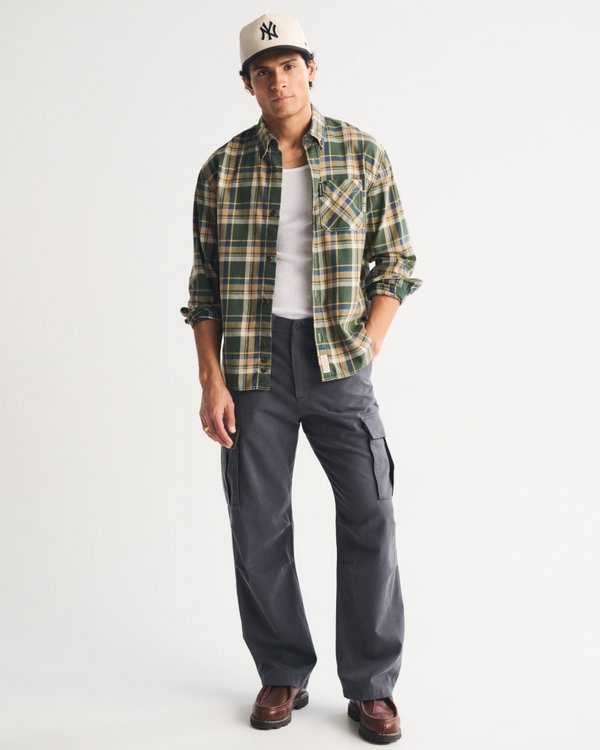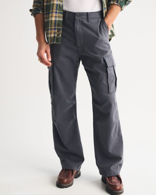 Our cleaned up cargo-style pants in a soft cotton-blend fabric and baggy-fit silhouette. Features cargo-style pockets, knee seaming details and button fly closure. Imported.