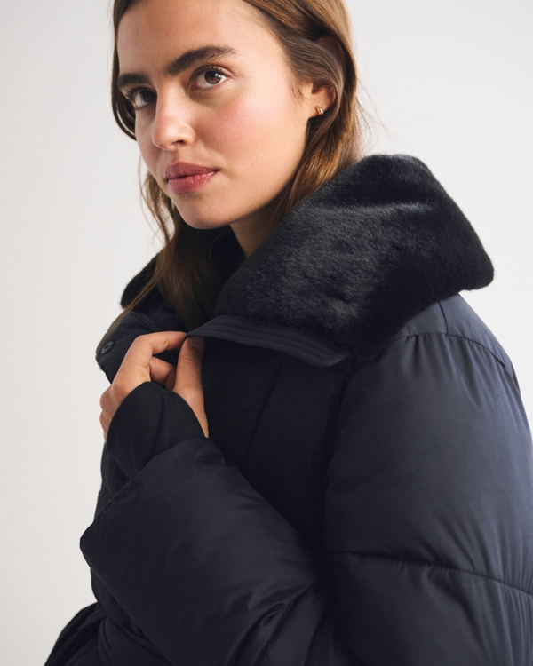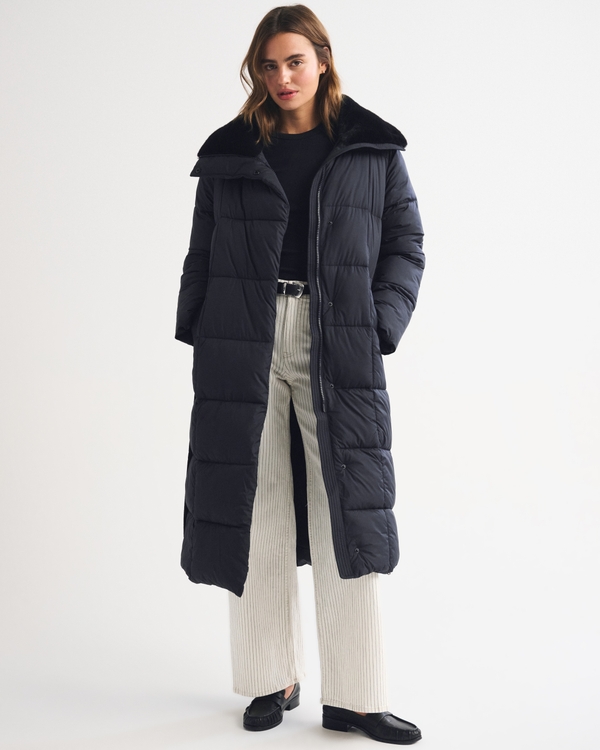 Our classic long puffer jacket in a wind- and water-resistant technical fabric. Features an adjustable belt at the waist, zip- and snap-up front, storm cuffs, zip-up side vent hem, fleece-lined pockets, interior zip pocket and recycled fill. Imported.