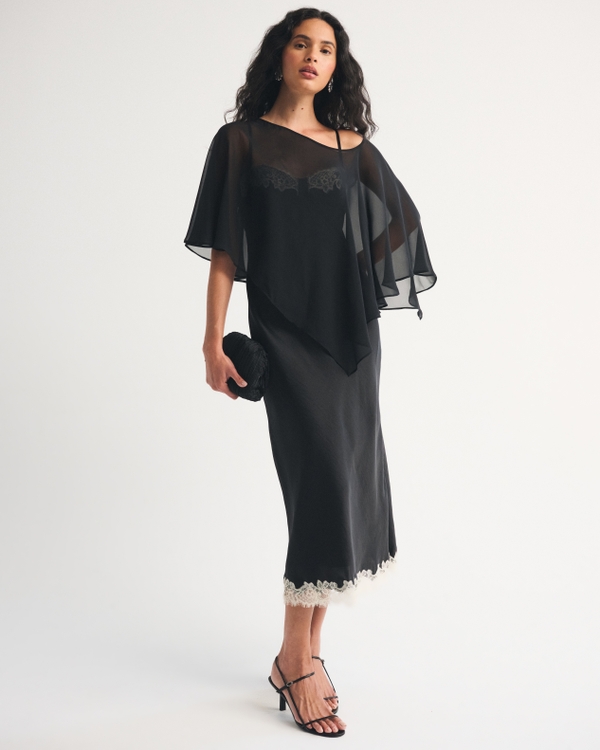 Our new collection built to make going bra-free that much smoother. This flattering midi dress is in our textured satin fabric. Features a removable sheer poncho, lace-trim details throughout, and a seamed-in bra with removable pads. Imported.