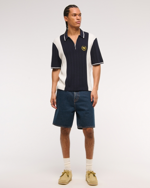 Comfortable short-sleeve sweater polo in a soft sweater-knit fabric and relaxed-fit silhouette, featuring Cadillac graphic detail at left chest, half-zip detail, classic vertical rib stitching details throughout, classic polo collar and banded hem and cuffs. Imported.