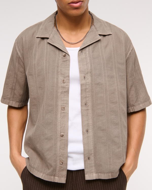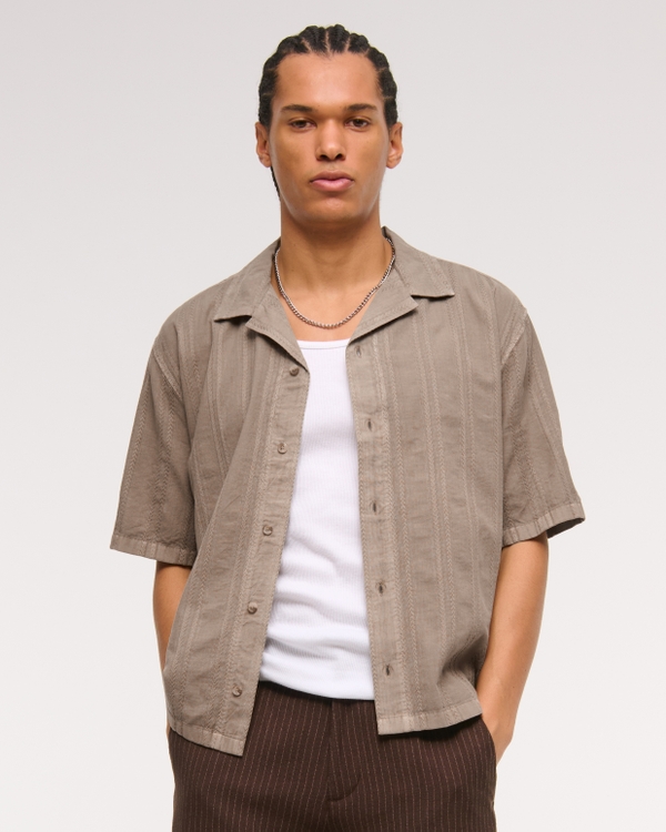 Comfortable short-sleeve button-up shirt in our soft cotton fabric, featuring a relaxed-fit silhouette, resort-style camp collar, all-over textured braided details and straight hem. Imported.