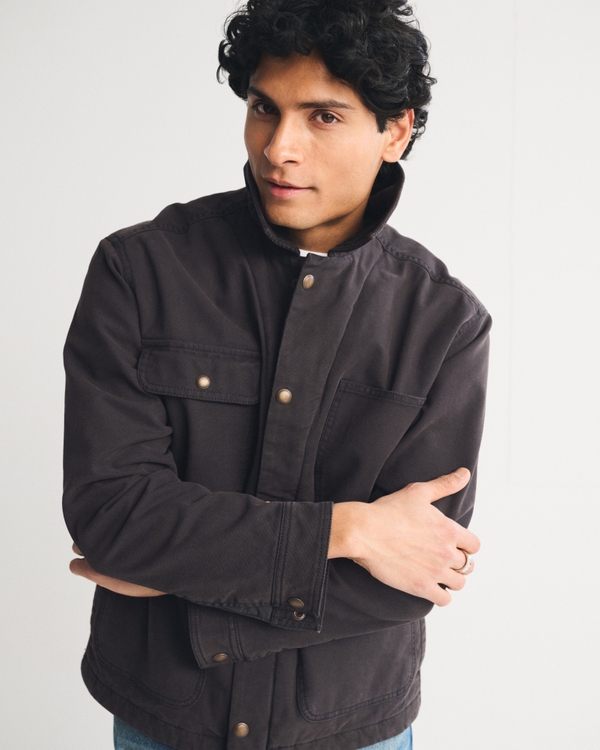 Our comfortable trucker-style jacket in a soft canvas fabric and relaxed-fit silhouette. Features pockets throughout, a corduroy fold-down collar, zip- and snap-up front and lightweight interior lining. Imported.