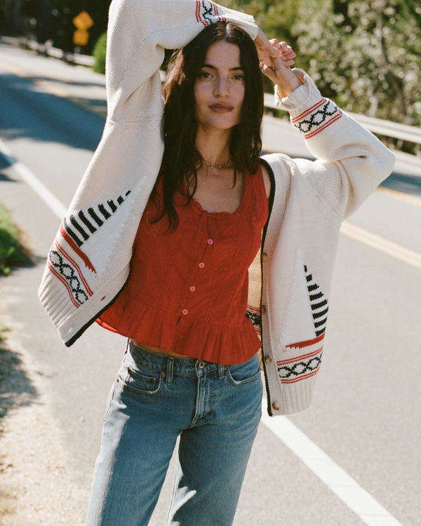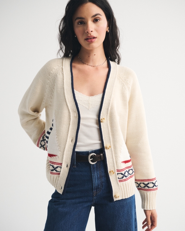 Comfy oversized cardigan in our soft sweater yarn fabric. Features coastal-inspired graphic details, a V-neckline, button-up front and rib trims at the neckline, hem and cuffs. Meant to fit like you pulled it right from your dad's closet. Imported.