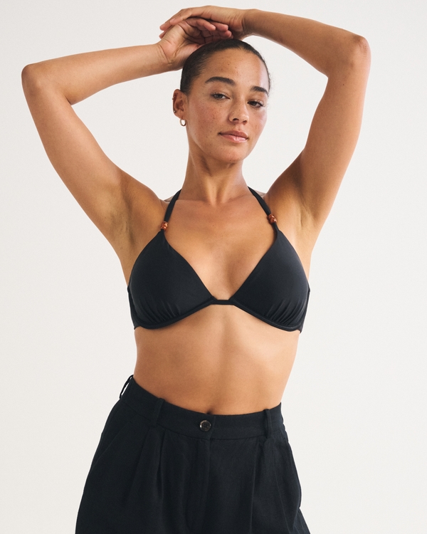 Our halter triangle bikini top in our core swim fabric with a supportive underwire and our Curve Love fit, designed for cups D-F. Curve Love includes fuller bust support with a proportionally smaller band size. Features beaded details along the fully adjustable straps at the neck and flattering adjustable back clasps. Imported.