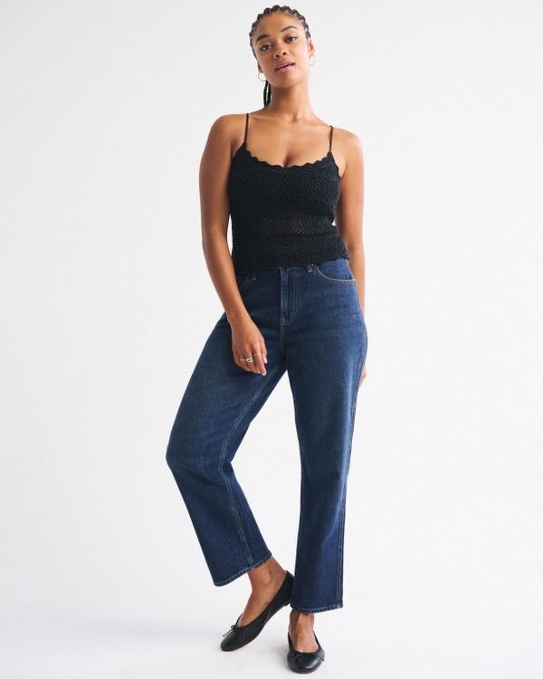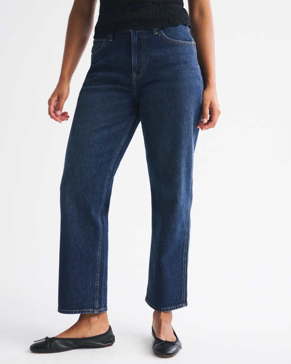 Our Curve Love high rise cropped straight jeans in a dark wash with a clean hem. This fit features a high rise, is fitted at top of body and eases through the thigh into a straight leg shape with a with a cropped inseam. The viral fit that eliminates waist gap: Curve Love features additional room through the hip and thigh for curve-hugging comfort. This jean is made from our Vintage Stretch fabric which features both an authentic vintage look and contains slight built-in stretch for additional comfort. Imported.