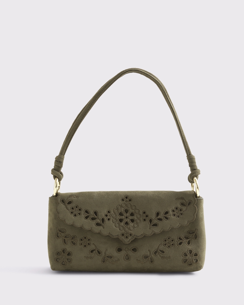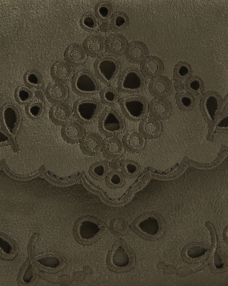 Our small shoulder bag in a soft fabric with an elevated adjustable shoulder strap. Features embroidered cutwork details throughout, foldover detail, zipper closure and an interior pocket. To avoid color transfer, keep away from light color clothing and upholstery. Imported.