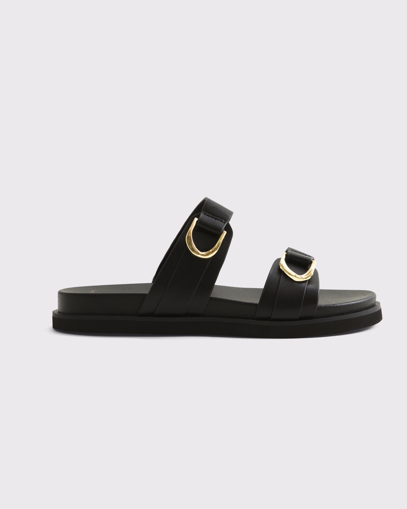 Our new slide sandals featuring a flattering double-strap with gold hardware detail across the foot and a built-out footbed. Perfect to dress up or down! Imported.