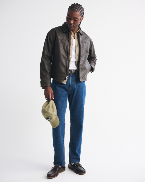 Our new lightweight trucker-style jacket in a soft vegan leather fabric and cropped length, featuring a relaxed-fit silhouette, side pockets with interior chest pocket, fold-down collar, zip-up front and lightweight interior lining. Imported.