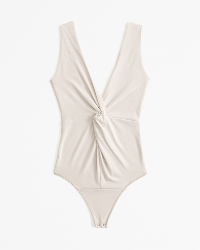 Slim-fitting bodysuit in our elevated glossy rib fabric, featuring trendy twist-front detail, plunging v-neckline, all-over ribbed detail and two-snap bottom closure. Imported.