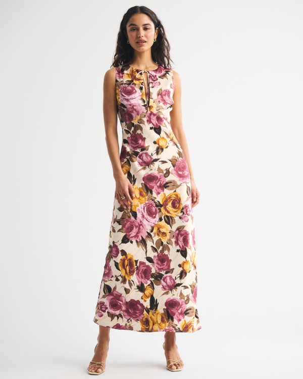 Flattering maxi dress in our textured satin fabric. Features an adjustable tie-front detail, open-back detail and a high neckline. Imported.